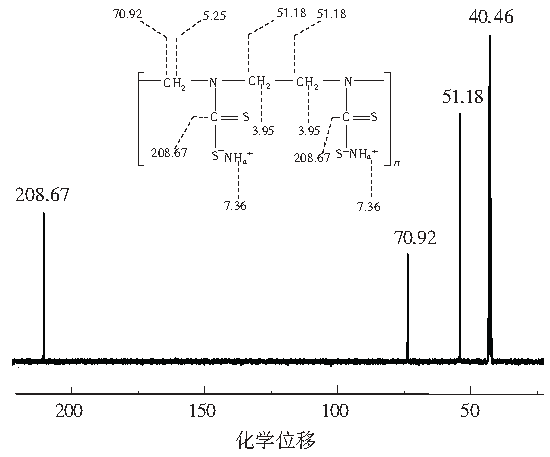 PADTC的1H和13C核磁共振光譜如圖2和圖3所示。在圖2氫譜中,化學(xué)位移為5.25、3.95、7.36的峰分別屬于—CH2、—CH2—CH2和NH4+中的氫。在圖3碳譜中,70.92、51.18和208.67的化學(xué)位移屬于—CH2、—CH2—CH2和—S—C═S中的碳。